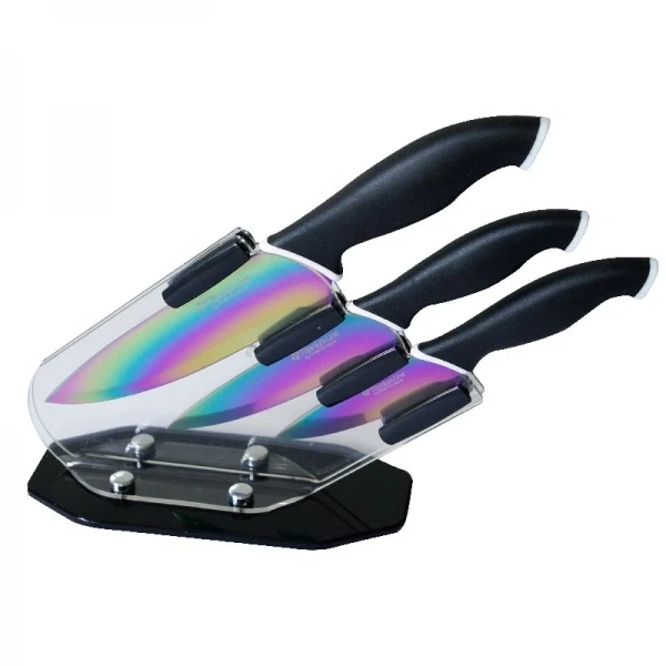 Bloc composĂ© de trois couteaux de cuisine avec lame en acier inoxydable et revĂȘtement en titane, qui offre Ă la lame une duretĂ© supplĂ©mentaire, un tranchant extraordinaire et un superbe aspect irisĂ©. Vous allez redĂ©couvrir l’art de la dĂ©coupe avec prĂ©cision et finesse avec ces couteaux de cuisine.