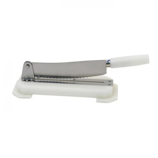 Ce coupe pain professionnel de fabrication Française est composé d’un couteau à pain possédant une grande lame en acier inoxydable et crantée. La longueur de cette lame est de 25 cm et elle d’un tranchant très exceptionnel et remarquable. Son manche ergonomique avec poignée est fabriqué en polyéthylène et riveté, le tout fortement fixé sur un socle en polyéthylène équipé d’une plaque de propreté en inox, le tout d’une fabrication robuste.