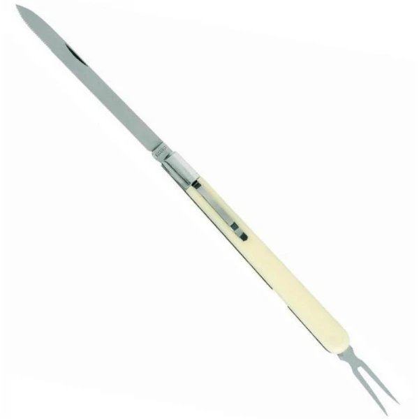 Ce couteau à dégustation est conçu avec deux pièces, lame et fourchette deux dents en acier inoxydable. Son manche mesure 12 cm il est fabriqué en synthétique façon ivoire. La dimension totale ouverte de ce couteau est de 25.5 cm, l’ouverture est très simple, il suffit d’ouvrir la lame à l’aide de l’encoche sur le flan.