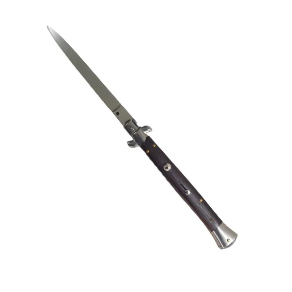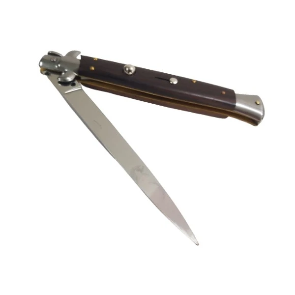 Son manche est en bois de palissandre et est doté d’une double mitre en laiton. La lame et la mitre de ce couteau automatique s’articulent sur le manche pour devenir un couteau pliant en position fermĂ©e. Un systĂšme de sĂ»retĂ© empĂȘche celui-ci de s’ouvrir inopinĂ©ment dans la poche. Pour l’ouvrir il est nĂ©cessaire de faire glisser la sĂ»retĂ© avant d’appuyer sur le bouton pression relĂąchant le ressort et la lame. Le systĂšme d’ouverture du couteau automatique est extrĂȘmement rapide et se fait d’une seule main mĂȘme avec des gants.