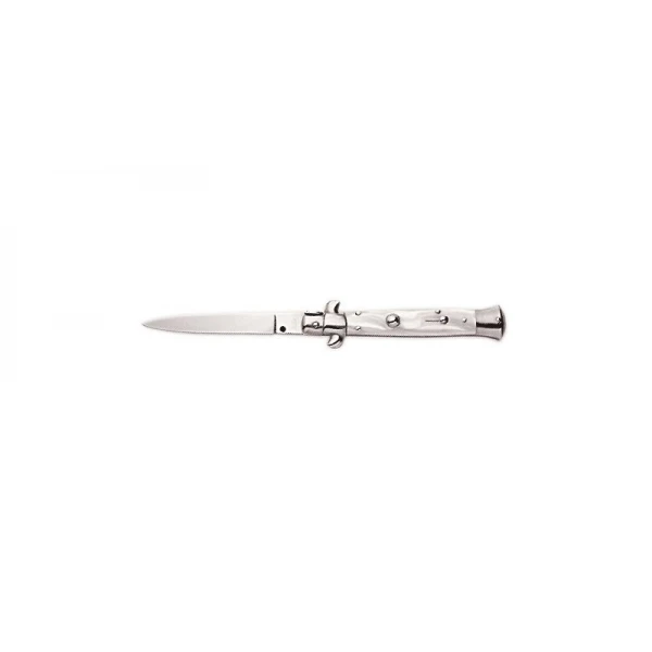 Ce couteau automatique à ouverture instinctive est dotĂ© d’un système de sĂ»retĂ© pour une sĂ©curitĂ© optimale. Il est composĂ© d’une lame de 9 cm fine et très pointue en acier inoxydable. Son manche est en matière synthĂ©tique NacrĂ© avec de jolis reflets.