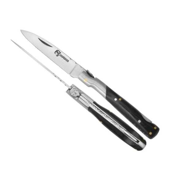 Ce petit couteau Corsica est un couteau pliant traditionnel Corse, dont le design si spĂ©cifique repose sur son dĂ©crochĂ© au niveau de la mitre. Il mesure 19 cm de long constituĂ© d’une lame de 9 cm et d’un manche ergonomique en corne de 10,5 cm dotĂ© d’une mitre en inox brossĂ©.