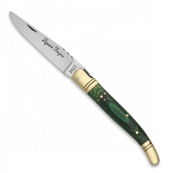 Ce couteau pliant Laguiole est un remarquable petit couteau pliant de loisir à de multiples fonctions conçu par Laguiole Bougna. Il est constituĂ© d’une lame lisse et pointue de 10 cm en acier trempĂ© traitĂ© anti-corrosion et d’un tranchant remarquable. Le manche est en bois teintĂ© de couleur verte pour se fondre dans le dĂ©cor, protĂ©gĂ© par une double mitre en laiton.