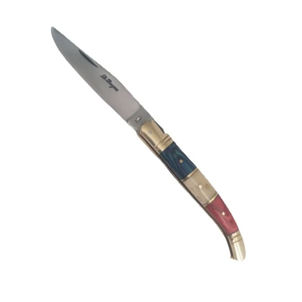 Ce couteau de poche RĂ©publicain est un couteau pliable aux couleurs bleu, blanc, rouge. Sa lame est lisse au tranchant impeccable, elle est fabriquĂ©e en acier inoxydable et mesure 10.5 cm. Son manche mesure 12 cm et est en bois colorĂ© avec sa mitre laitonnĂ©e.Â