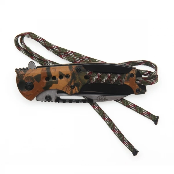 Son manche est en aluminium de finition baroudeur avec son décor feuillage très nature et son cordage de 35 cm.