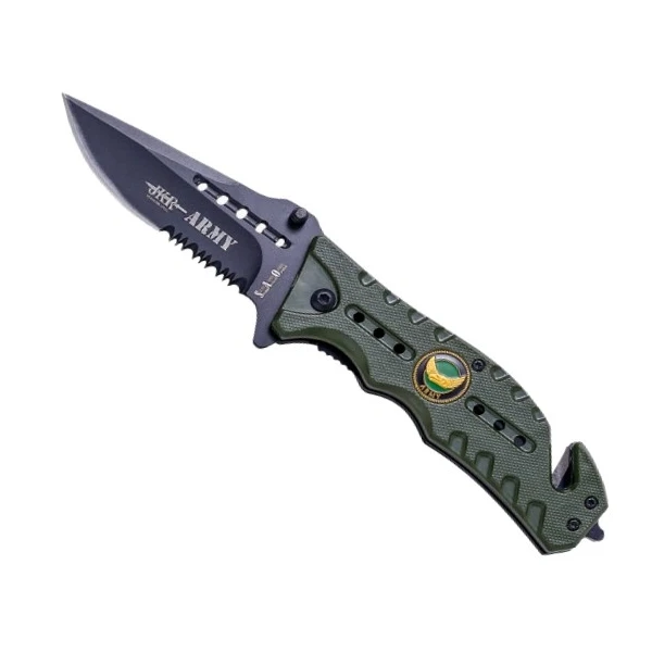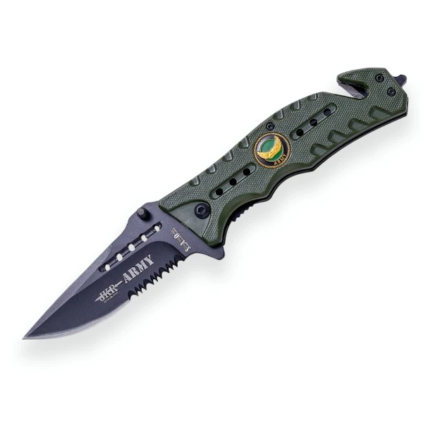Ce couteau de sauvetage ou encore appelĂ© couteau de survie est un couteau pliant de sĂ©curitĂ© dotĂ© d’une lame noire semi crantĂ©e au format poche et au design militaire ARMY, très masculin.