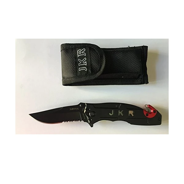 Ce couteau de survie de la Marque Joker JKR est doté d’une lame de 8 cm en acier inoxydable de couleur noire avec une partie lisse et crantée sur 3 cm. Son manche est fabriqué en ABS rigide, il mesure 12 cm et est équipé d’un casse verre, d’un coupe ceinture et d’un clip ceinture métallique noir.