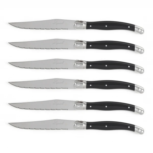 Ce set de 6 couteaux Laguiole est un lot de couteaux à usage mixte au quotidien. Les lames sont en acier inoxydable et elles mesures 11 cm, les manches sont en ABS et mesures 15 cm, ces derniers sont fabriqués avec 5 rivets.