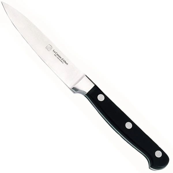Ce couteau de cuisine est un petit couteau à lame droite courte et pointue, dépourvue de dent, indispensable pour peler les légumes, les couper en dés ou en rondelles. Avec son manche en POM (résine acétal) anti glissant avec butée, il est très agréable à prendre en main. Ce couteau d’office offre une grande maniabilité et devient indispensable à tous cuisinier.