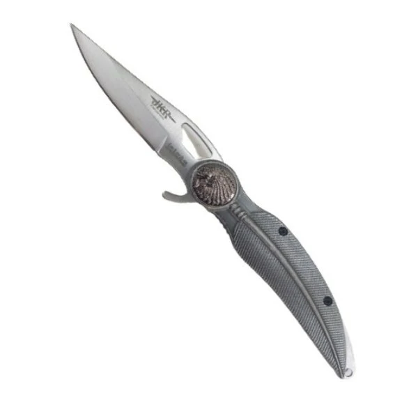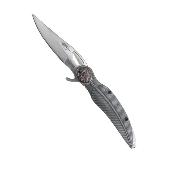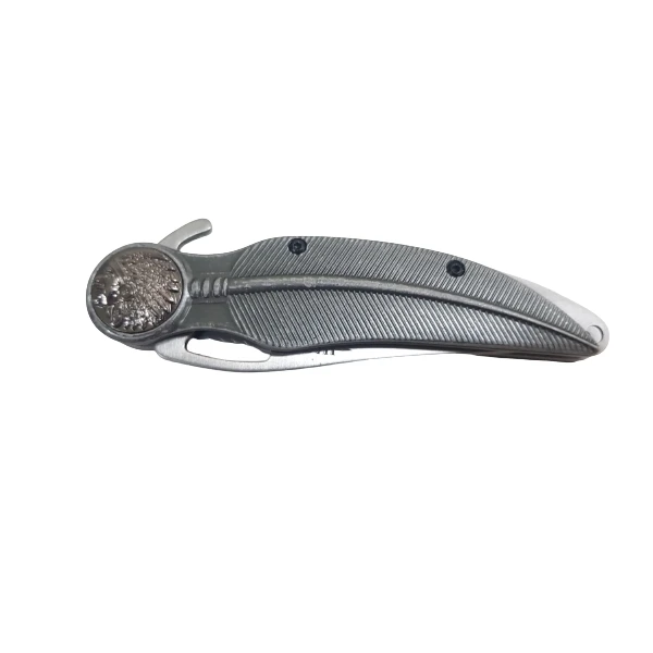 Excellent design pour ce couteau pliant avec son manche reprĂ©sentant une plume et un Ă©cusson d’une tĂŞte d’Indien. Il est très maniable et conçu tout en mĂ©tal, ce qui lui confère une soliditĂ© Ă toutes Ă©preuves. Sa lame est en acier inoxydable et mesure 6.8 cm. Son manche mesure 11 cm, il est antidĂ©rapant et fabriquĂ© en inox, il vous apportera une bonne prise en main.Â