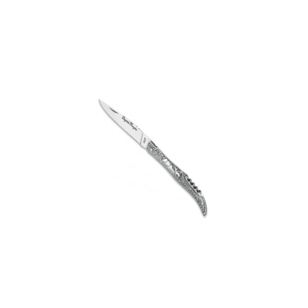 Joli couteau pliant Laguiole tout mĂ©tal dotĂ© d’un tire bouchon toujours très utile pour ouvrir une bonne bouteille lĂ oĂą l’on se trouve; Sa taille fermĂ© est de 12 cm, sa lame est en acier inoxydable, elle mesure 10.5 cm. Le manche de ce couteau pliant est particulièrement plaisant avec son dĂ©cor de montagne, agrĂ©mentĂ© d’un Cerf.Â