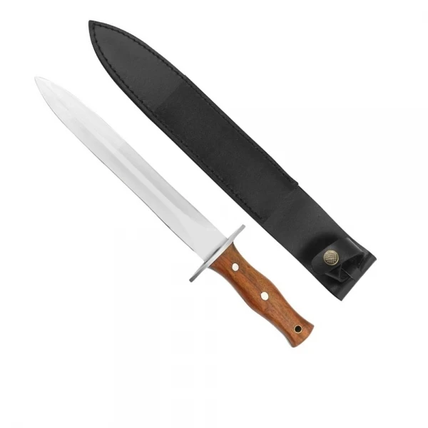 Son manche est en bois clair et dotĂ© d’un trou pour un passage de lacet, la main est protĂ©gĂ©e de la lame par une garde toute simple. Cet ustensile de chasse est très maniable, malgrĂ© sa taille et d’une bonne tenue en main. Ce poignard est très robuste et idĂ©al pour trancher, couper, dĂ©couper et pourra rĂ©pondre Ă toutes sortes d’occasions. Â