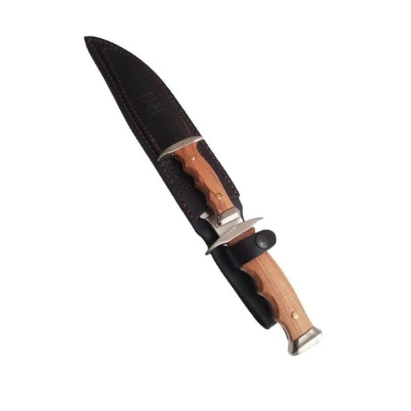 Le petit couteau est conçu avec une lame fixe de 11.5 cm, un manche en bois d’olivier de 9 cm, une garde de 6 cm et une mitre de 2.8 cm en laiton. Ce dernier est couramment utilisĂ© pour diverses petites tâches sur le terrain de chasse.