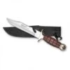 Son manche est en bois clair et ornĂ© d’un rouleau en cuir, votre main est bien protĂ©gĂ©e de la lame grâce Ă une garde toute simple. Très maniable, malgrĂ© sa taille et de bonne tenue en main, cette dague de chasse-combat est très robuste et idĂ©ale pour trancher, couper, dĂ©couper et pourra rĂ©pondre Ă toutes sortes d’usages… Â