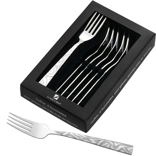 Ce coffret 6 fourchettes à gâteau en acier inoxydable, manches travaillés miroirs et sablés, avec motif, corps et dents en acier inoxydable de qualité.