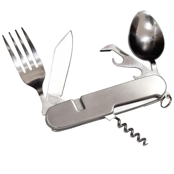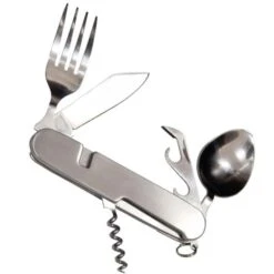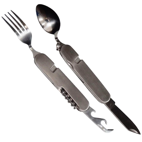 Ce couteau multifonction est Ă©quipĂ© de couverts, c’est un couteau pliant et dĂ©tachable en 2 parties pour former 2 couverts sĂ©parĂ©s avec outils intĂ©grĂ©s. La première partie est une fourchette avec dĂ©capsuleur avec un ouvre-boite et un tire-bouchon. La 2 ème partie est un couteau Ă lame lisse d’un cĂ´tĂ© et une cuillère de l’autre.
