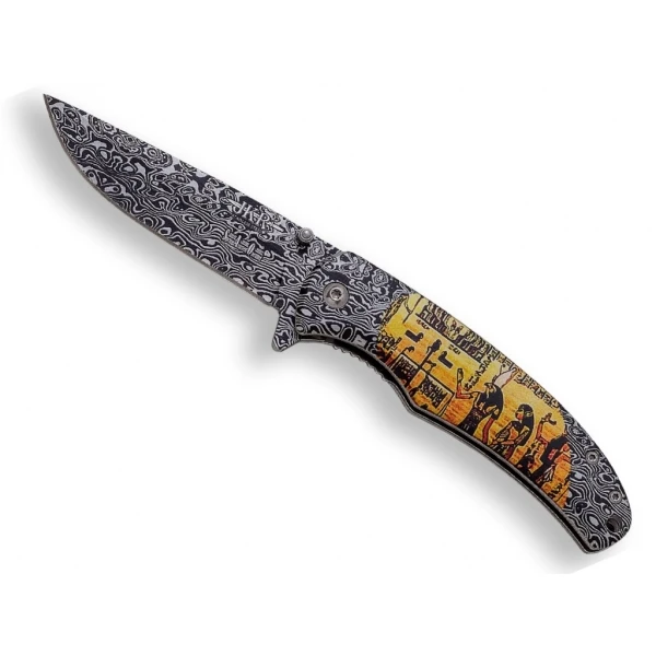Joli Couteau pliant de poche avec ouverture assistée, sa lame est fabriquée en acier inoxydable et elle mesure 8.5 cm avec une imitation Damasco. Son manche est fabriqué en aluminium et est décoré de magnifiques motifs Egyptiens.