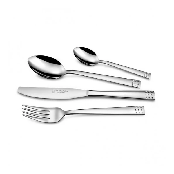 Cette ménagère 24 pièces très moderne de la gamme « Albert de Thiers » comprend 24 couverts de table en acier inoxydable, finition miroir. La lame des couteaux de table sont estampillés « La table d’Albert » les bouts de manches sont gravés de 9 points et sont très ergonomiques.