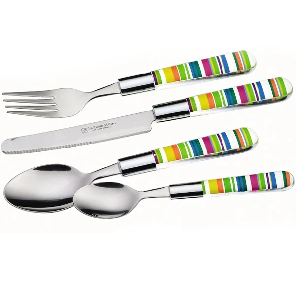 Cette jolie ménagère « Albert de Thiers », contient 24 couverts de table en acier inox et manches en plastique ABS transparents ergonomiques, à inclusion de motifs stries colorées. Les couverts, sont en acier inoxydable de qualité. La ménagère comprend: 6 fourchettes, 6 couteaux à lame micro-dentée, 6 cuillères à café et 6 cuillères à soupe. Une ménagère colorée, pour des tables contemporaines et une touche de pep’s. Ces couverts de table peuvent être utilisés au quotidien et sont faciles d’entretien.