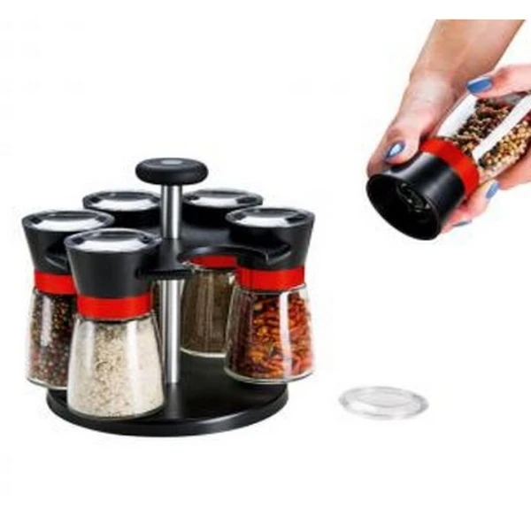 Cet ensemble moulin-pots à épices sur socle tournant, va vous faciliter la vie au quotidien, très pratique et design, vous gagnerez de la place sur votre plan de travail, vous ne perdrez plus de pots à épices, vous gagnerez du temps en regroupant tous vos pots à épices au même endroit. Vous trouverez très facilement le pot dont vous avez besoin, il vous suffit de faire tourner le tourniquet, jusqu’a celui souhaité. Ce moulin à épices comprends six pots en verre d’une contenance de 170 ml, pour remettre toutes vos épices: sel, poivre, curry, cunin, ail, herbes… Les pots sont interchangeables, mécanisme en ceramique.