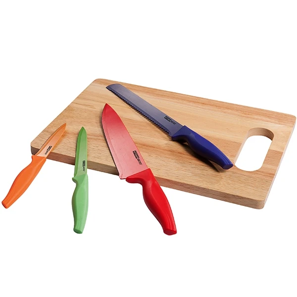Set planche à découper en bois, 4 couteaux de cuisine colorés!