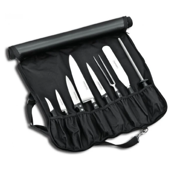 Cette sĂ©lection d’ustensiles de cuisine rĂ©pond aux exigences des grands chefs avec engagement d’une haute qualitĂ©. La sacoche est Ă©quipĂ©e d’une poignĂ©e et d’une laniĂšre bandouliĂšre pour un transport confortable.