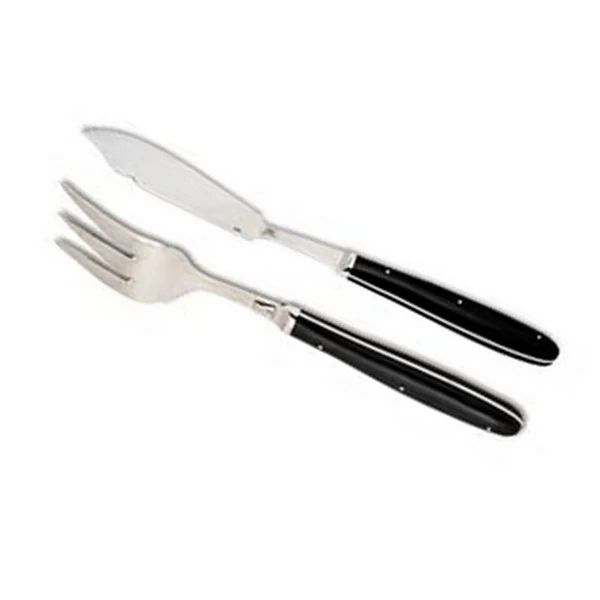 Ce service à poisson Laguiole comporte deux pièces : Une fourchette à trois dents pour prendre avec délicatesse la chair fragile, et un couteau dont la large lame sert à effeuiller le corps du poisson, à ôter la peau et à extraire les arêtes.