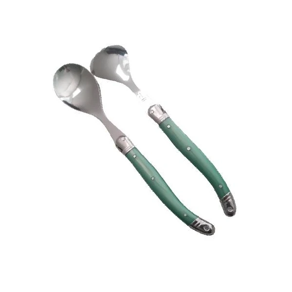 Service couverts Ă salade Laguiole Âź composĂ© d’une grande cuillĂšre et d’une grande fourchette dont le manche reprend le design bien spĂ©cifique de la marque Laguiole, sur ce mĂȘme manche, on y trouve Ă©galement l’abeille posĂ©e sur la mitre. Les couverts sont fabriquĂ©s en acier inoxydable et le manche de couleur vert est rivetĂ© en 3 points, il soutient une double mitre en inox.